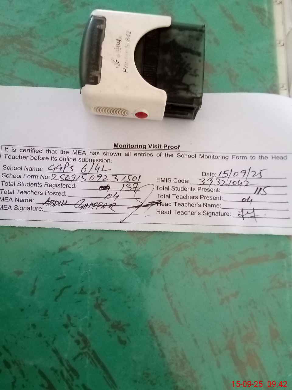 | Attendance Register | Head Teacher | MEA with School | Visit Proof |
