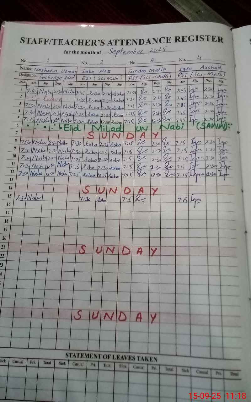 | CNIC | Full Name | Designation | R/C | Absence During Last Calender Month |