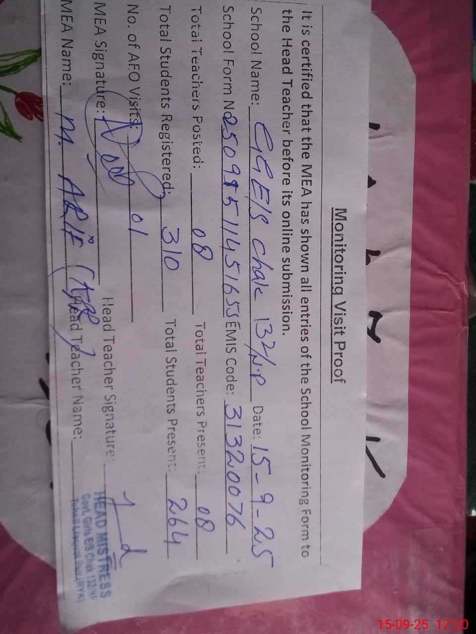 | EMIS Code: 31320076 | Name of School: GGES CHAK 132/NP | |||