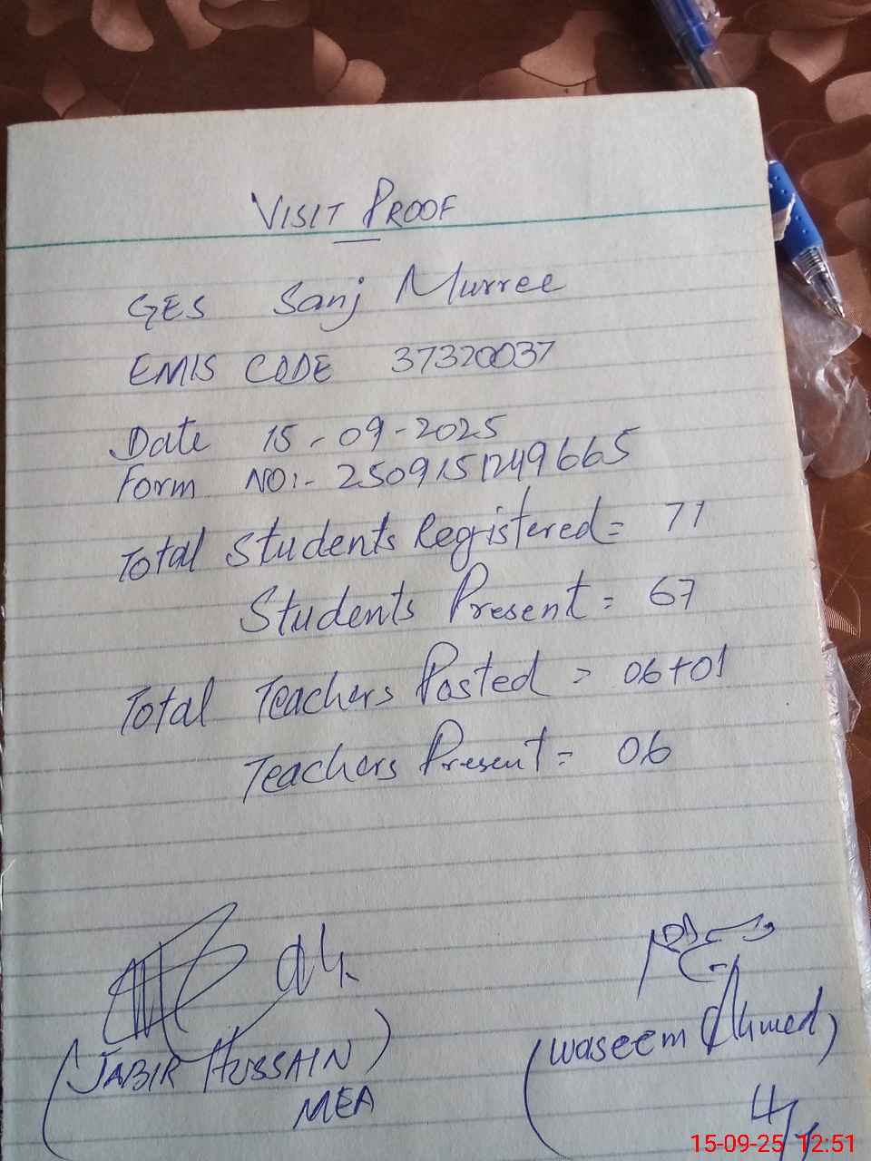 | Total no. of Classrooms: 8 No. of Classrooms Used for Teaching: 6 No. of Classrooms Storing Old Furniture, FTBs, etc: 0Comments if Any: One teacher name itfaq PST on LPR One teacher attached from GPS Sakari after school out source Boundary wall partially Random class check list not updated in pmiu application |