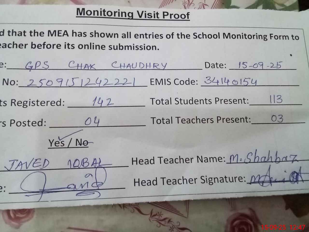 | Attendance Register | Head Teacher | MEA with School | Visit Proof |