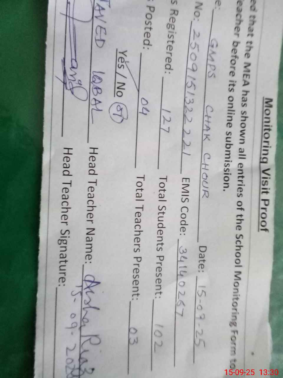 | Attendance Register | Head Teacher | MEA with School | Visit Proof |