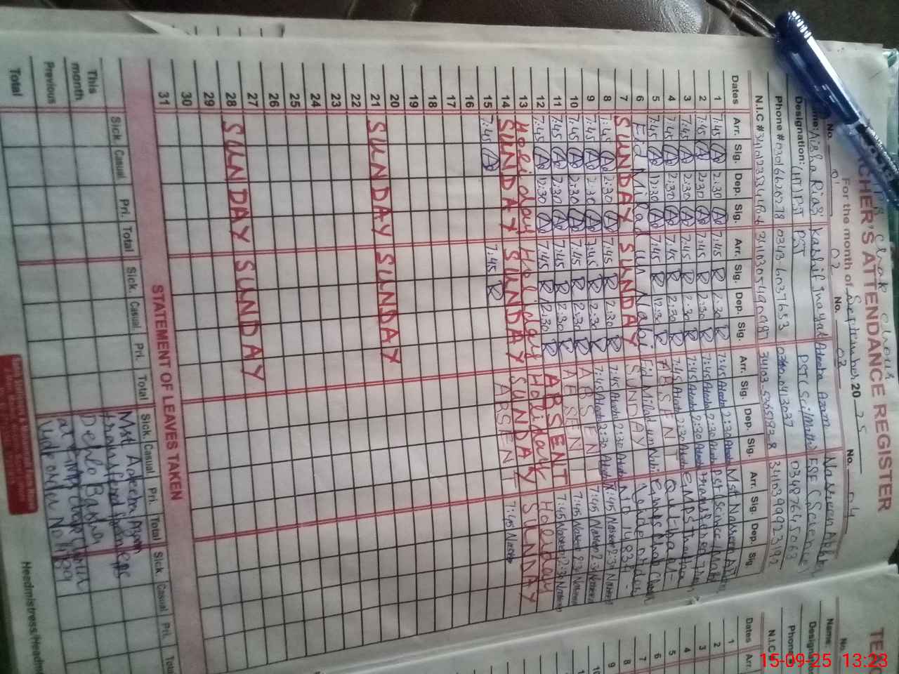 | Name: AY**** RI**** Designation: (School Headmaster's/Headmistress's) PST Phone/Cell Number: 03**** |