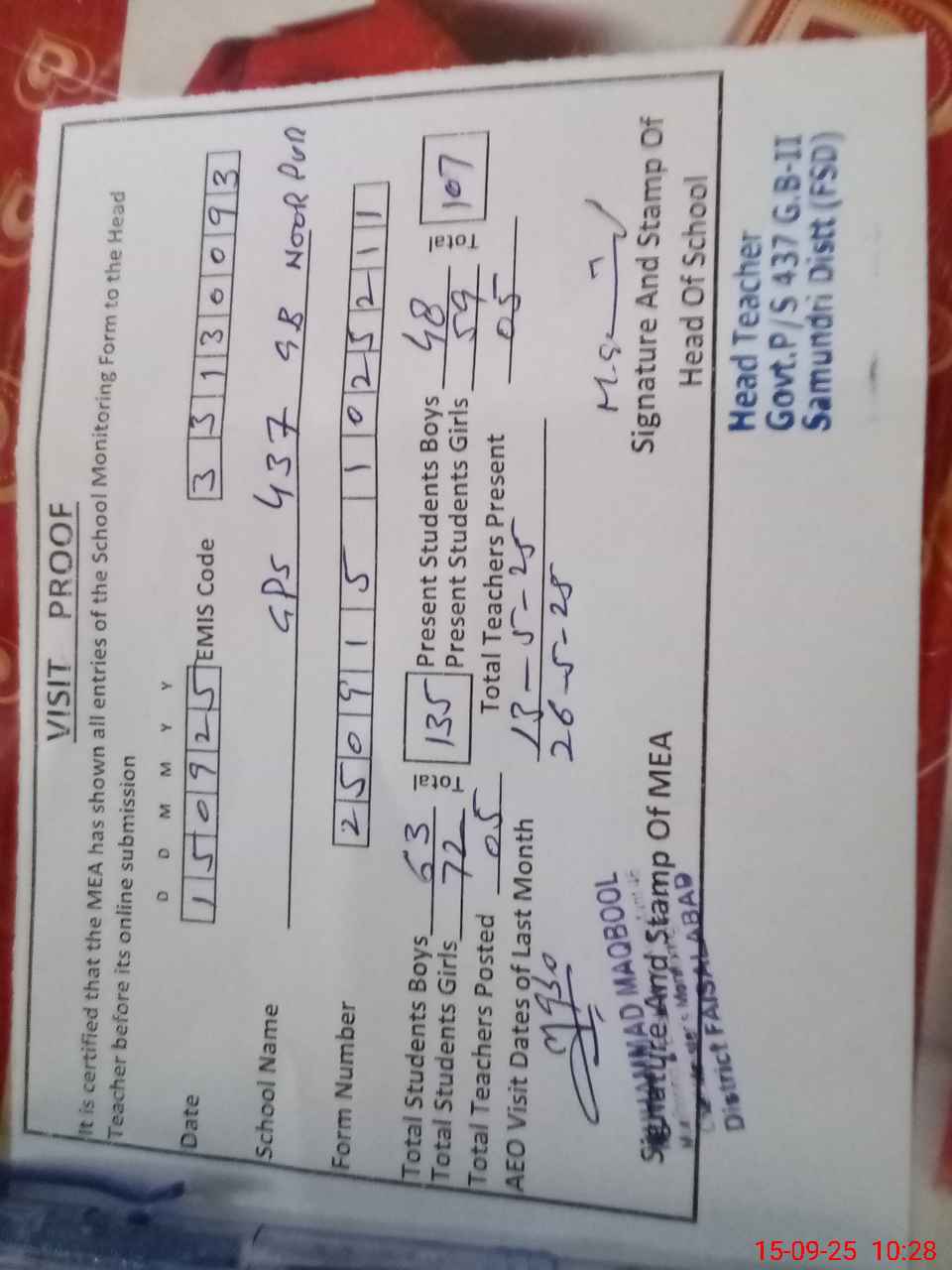 | EMIS Code: 33130093 | Name of School: GPS CHAK 437 GB N PUR SAMUNDRI | |||
