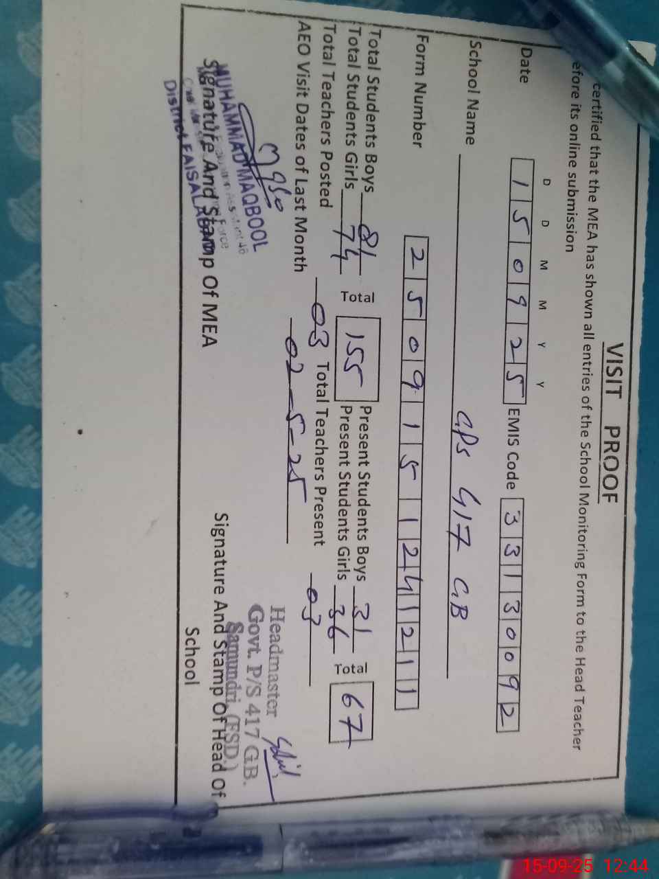 | Attendance Register | Head Teacher | MEA with School | Visit Proof |