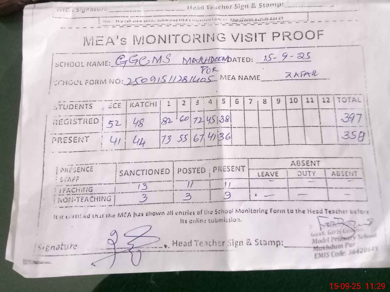 | Attendance Register | Head Teacher | MEA with School | Visit Proof |