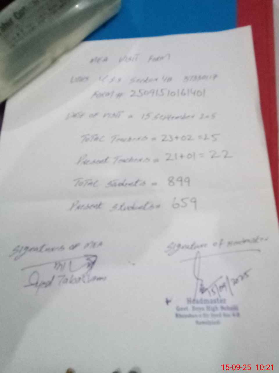 | Remarks (Use Separate Page if Required): Teacher M Ayaz pst and teacher Fahad Abdullaha tage on school sis but not shown on mea tab teacher Fahad Abdullaha is on casual leave Nsb not updated on sis | |||||