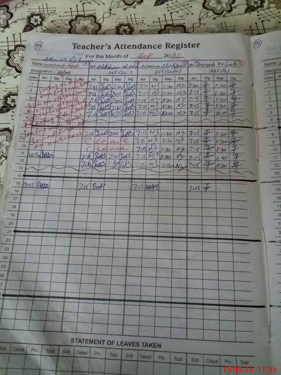 Leave Type | Remarks for today (Leave,Training, Exam,Absent,Late, Other duty) |