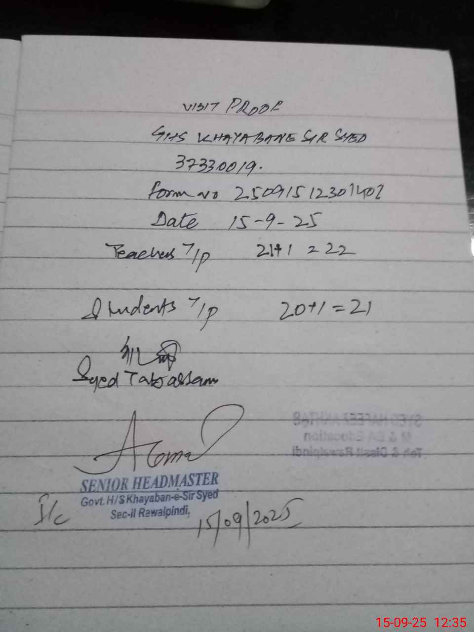 | Remarks (Use Separate Page if Required): Teacher Raja abid yaqoobbis not tage on school sis but he is present | |||||