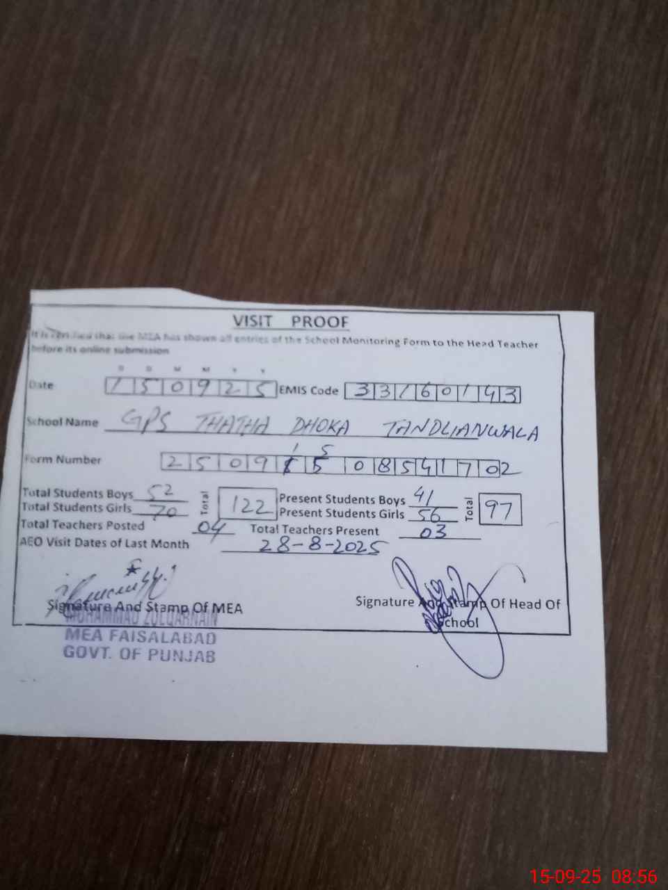 | EMIS Code: 33160143 | Name of School: GPS THATHA DOKA TANDLIANWALA | |||