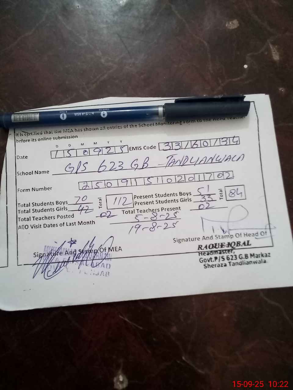 | EMIS Code: 33160134 | Name of School: GPS CHAK 623 GB TANDLIANWALA | |||