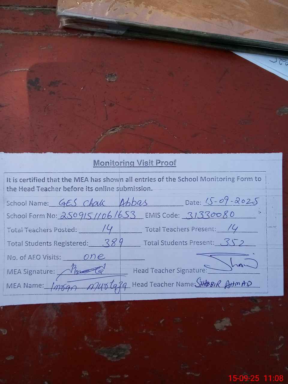 | Attendance Register | Head Teacher | MEA with School | Visit Proof |