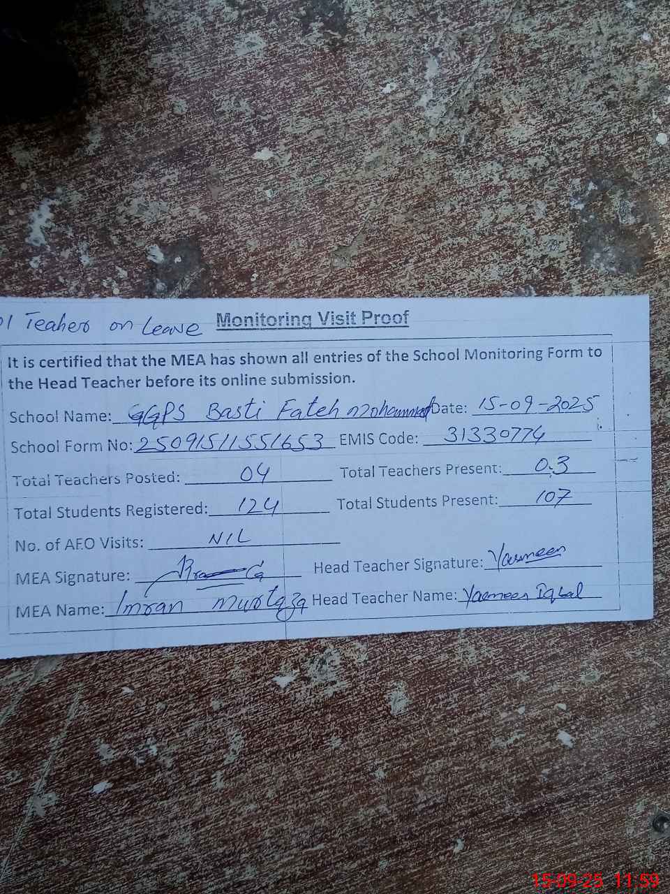 | Attendance Register | Head Teacher | MEA with School | Visit Proof |