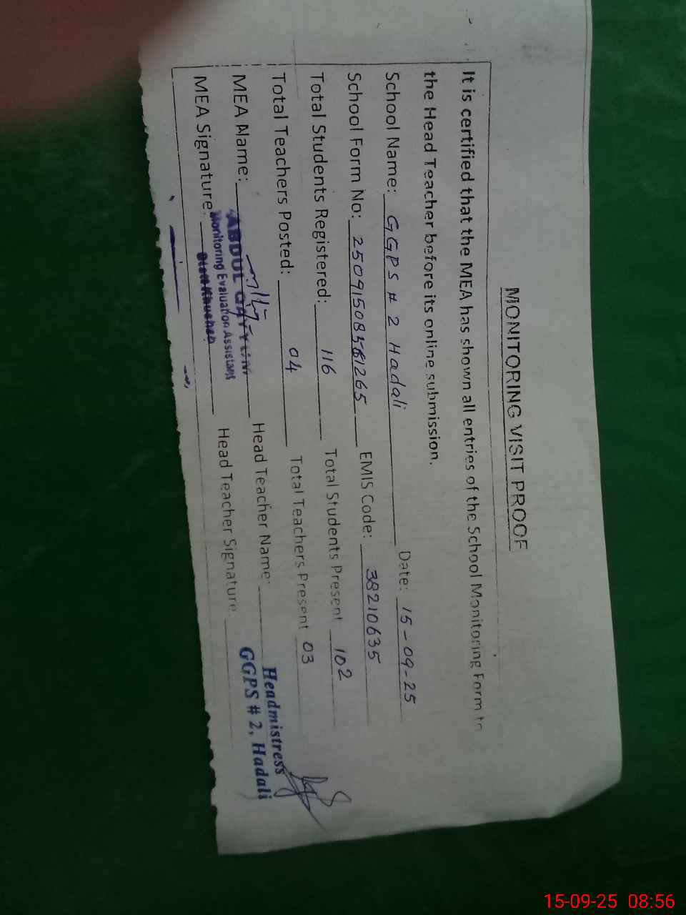 | Attendance Register | Head Teacher | MEA with School | Visit Proof |