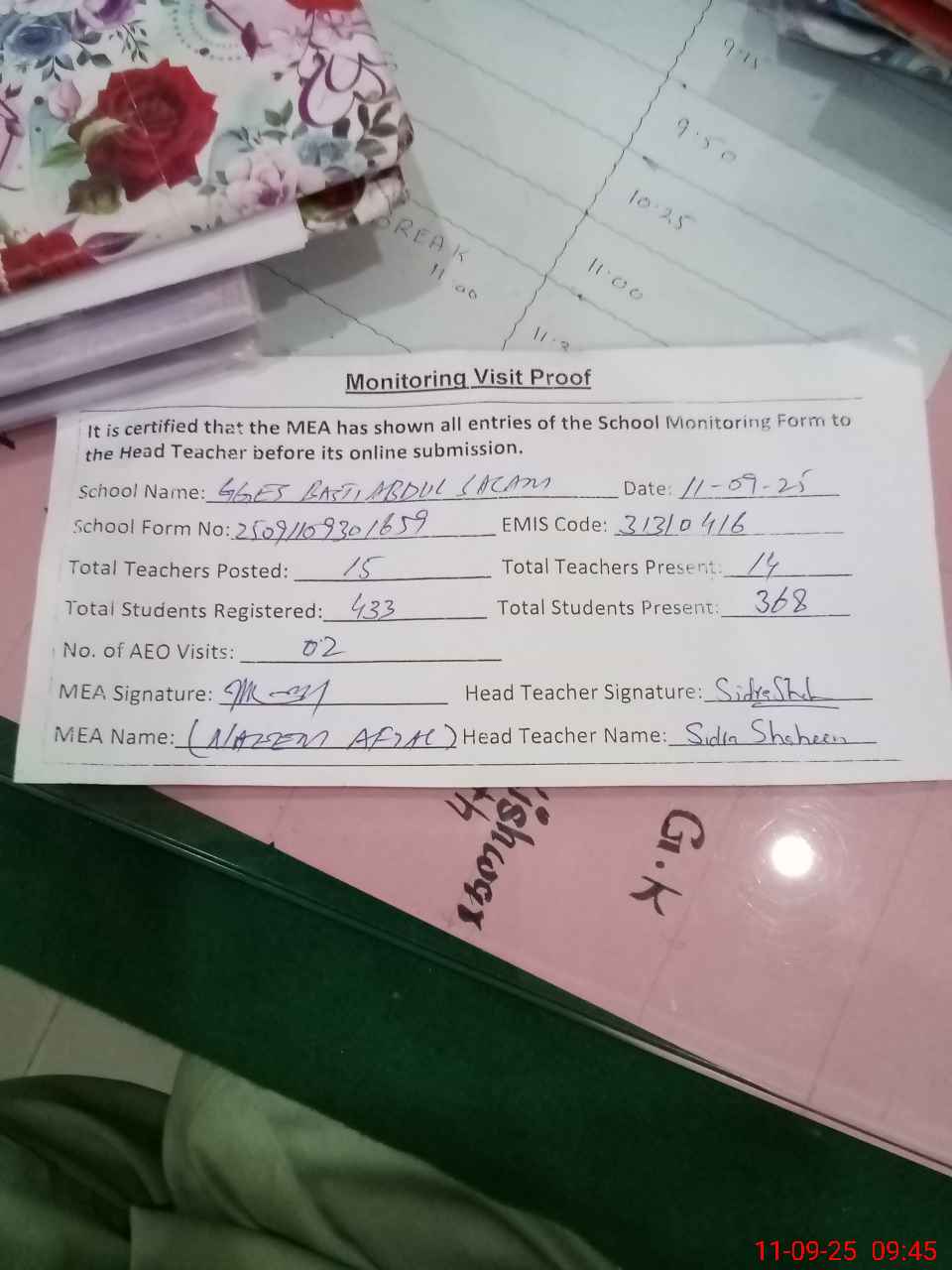 | Monitoring Date: 11-09-2025 | Start Time: 11-09-2025 08:55 AM | End Time: 11-09-2025 09:45 AM | Name of MEA: Na**** Af**** | |