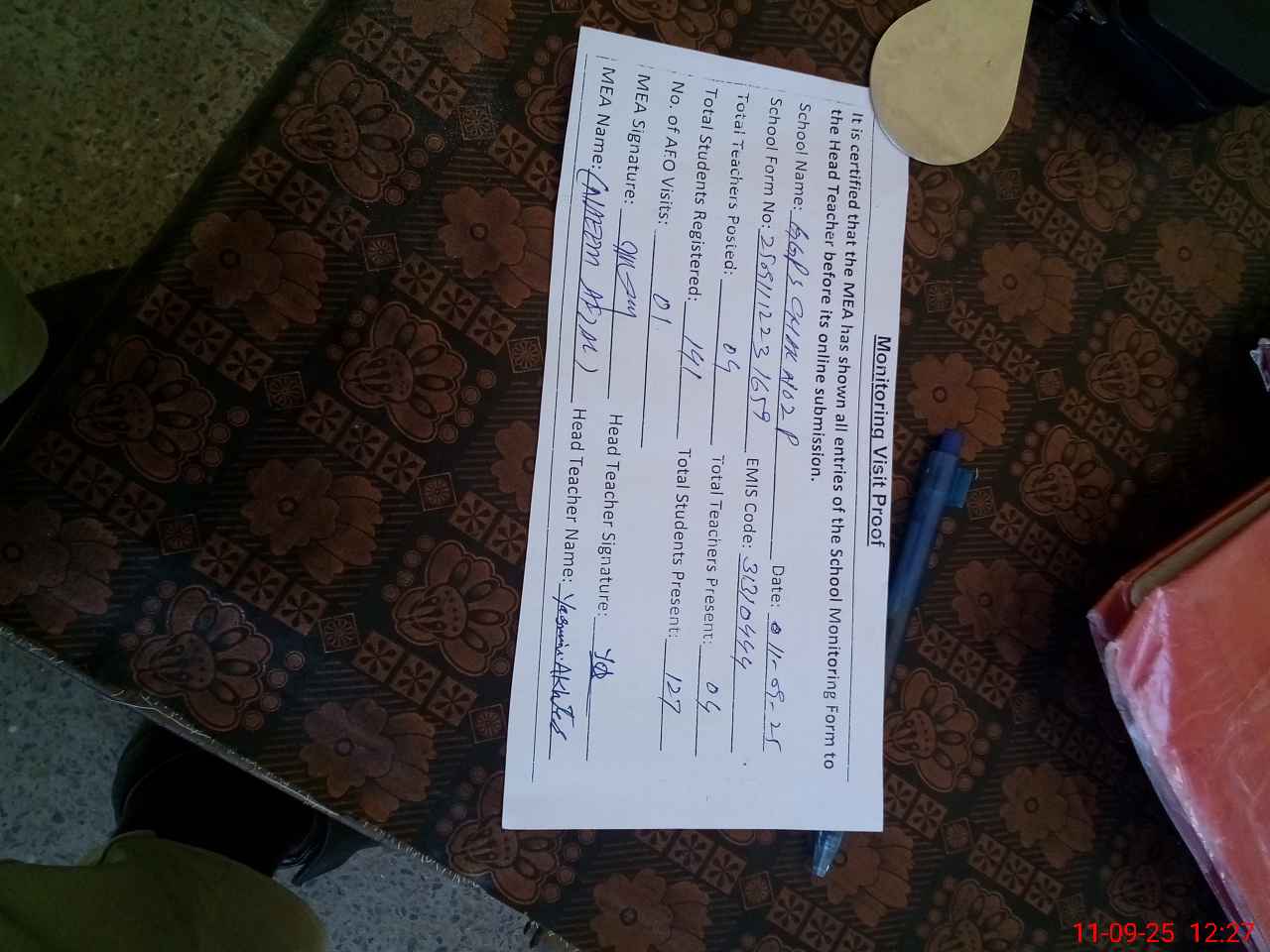 | Attendance Register | Head Teacher | MEA with School | Visit Proof |