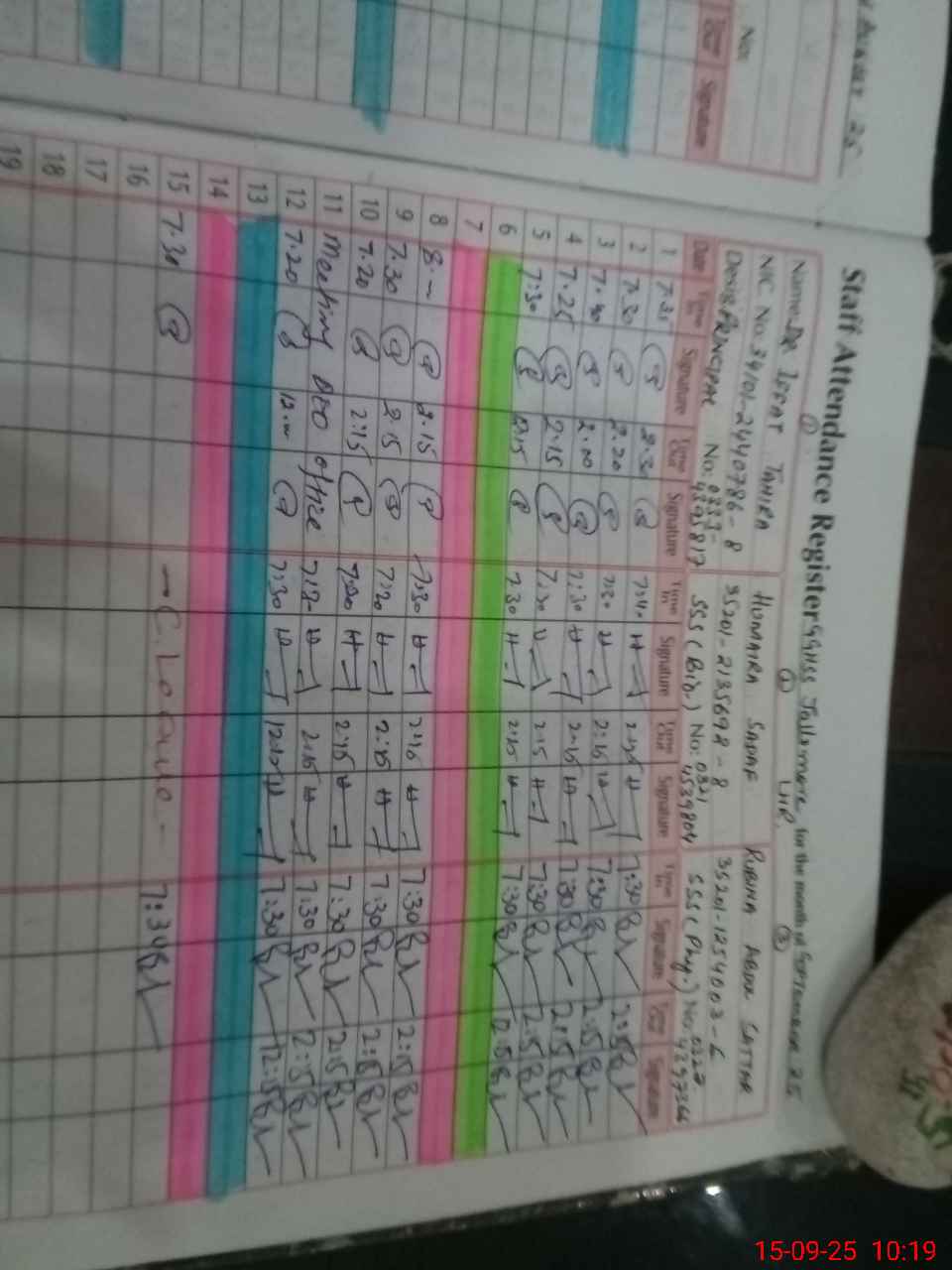 | CNIC | Full Name | Designation | R/C | Absence during last cal. month |