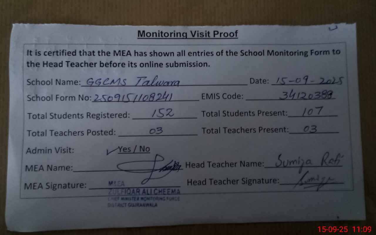 | EMIS Code: 34120388 | Name of School: GGCMS TALWARA | |||