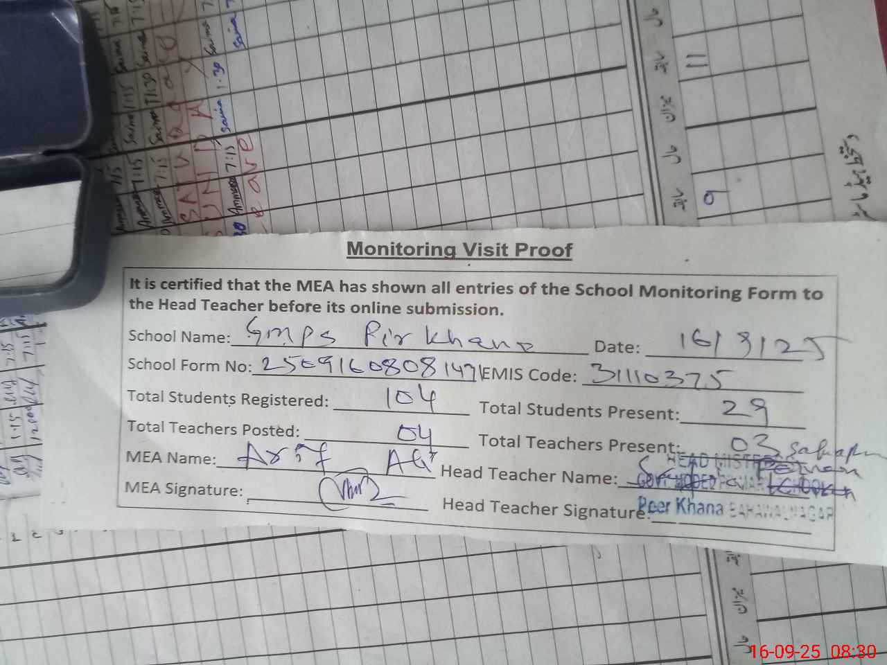 | Attendance Register | Head Teacher | MEA with School | Visit Proof |