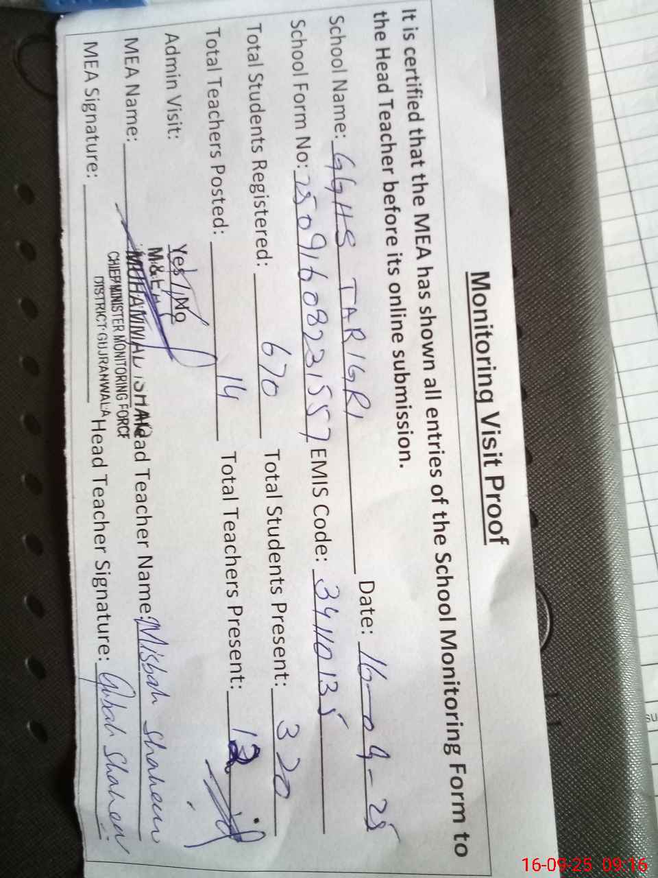 | Attendance Register | Head Teacher | MEA with School | Visit Proof |