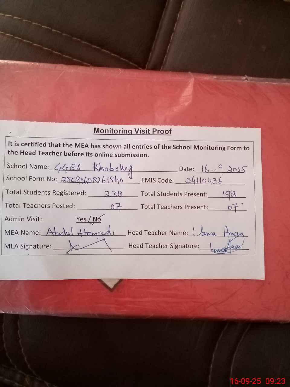 | Attendance Register | Head Teacher | MEA with School | Visit Proof |