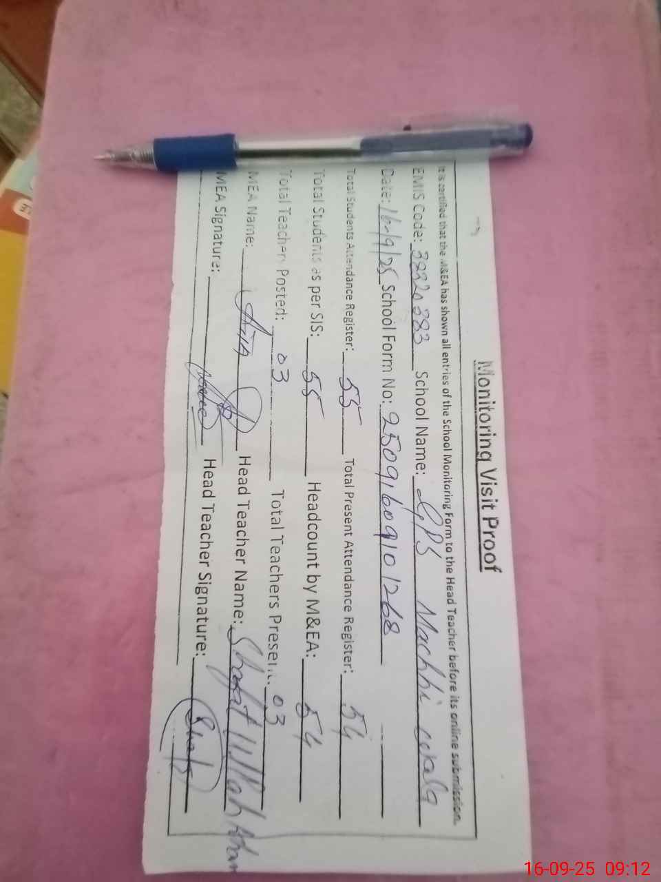 | Attendance Register | Head Teacher | MEA with School | Visit Proof |