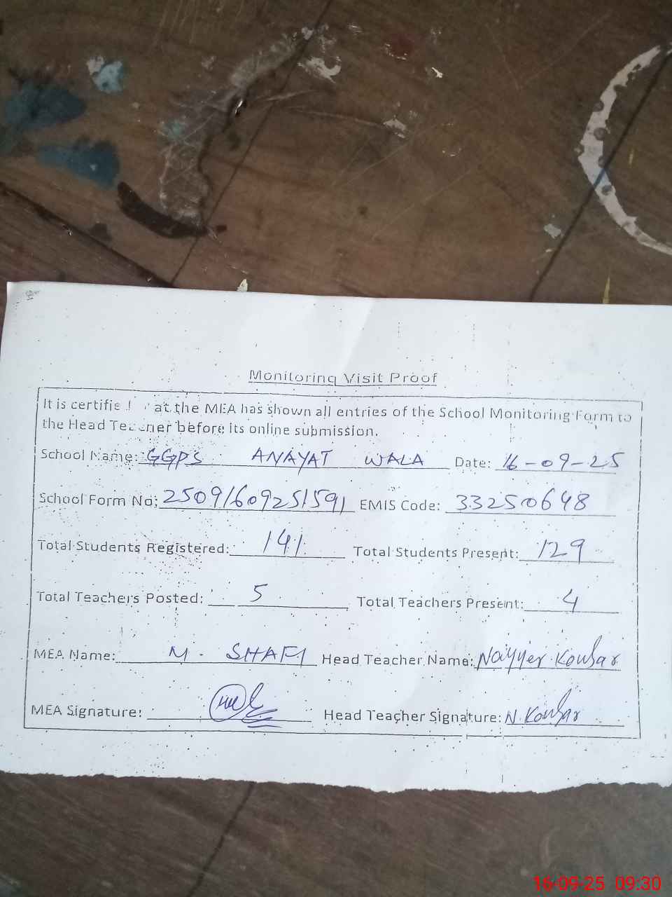 | Attendance Register | Head Teacher | MEA with School | Visit Proof |
