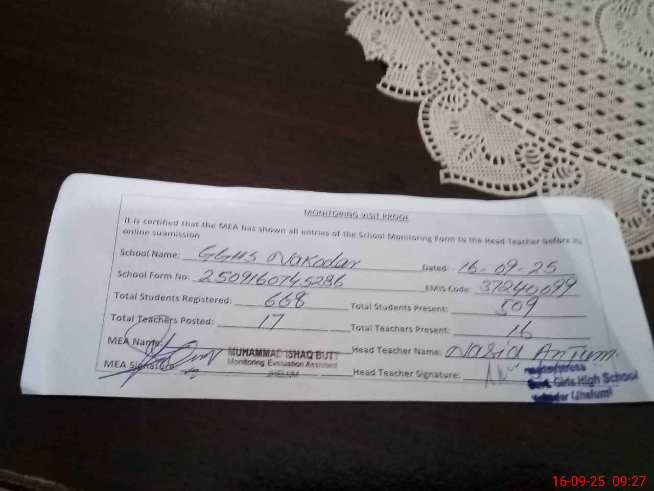 | Attendance Register | Head Teacher | MEA with School | Visit Proof |