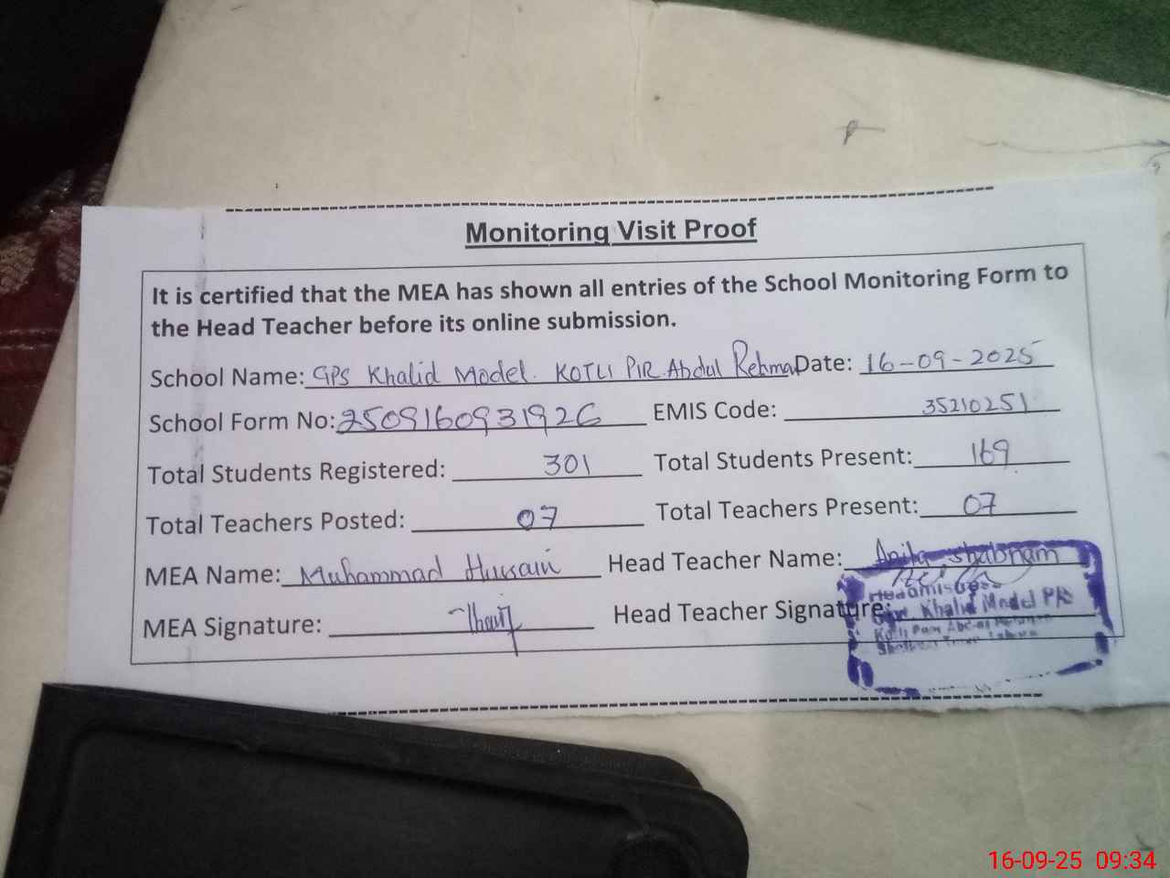 | Attendance Register | Head Teacher | MEA with School | Visit Proof |