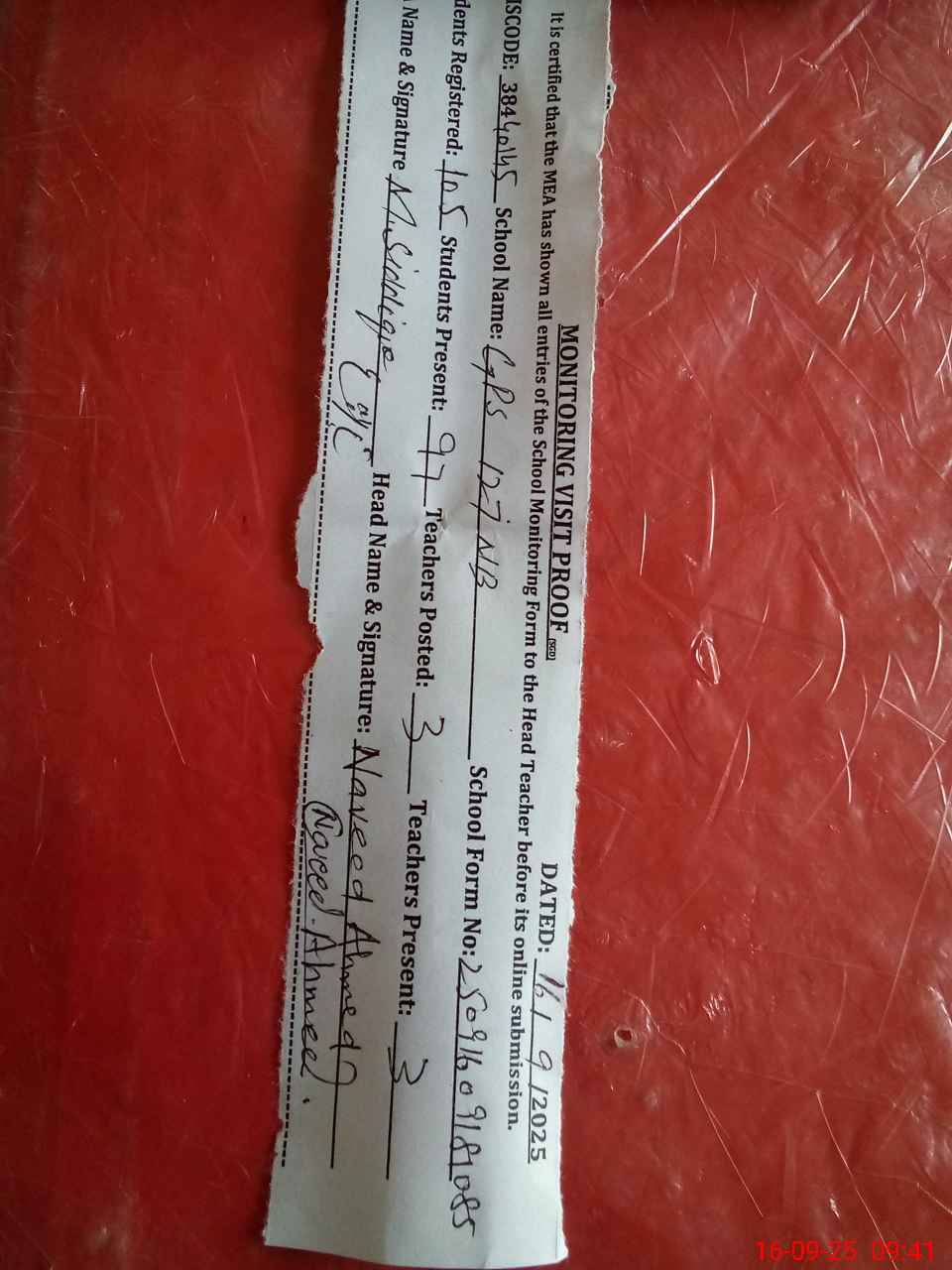 | Attendance Register | Head Teacher | MEA with School | Visit Proof |