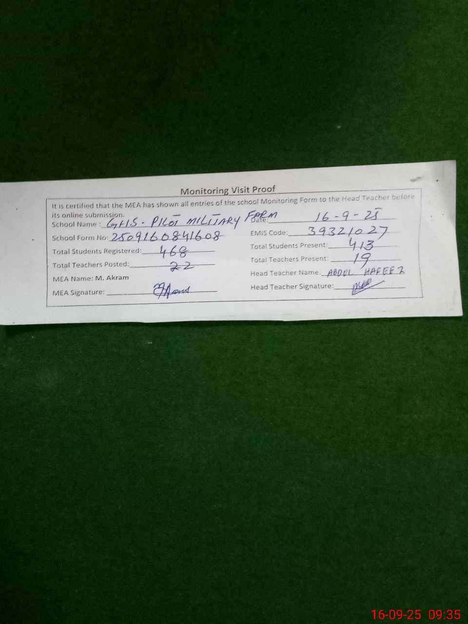 | Certified that this School was Inspected by the Undersigned MEA/DMO Today and the Information Stated Above is as Per Record. | |||||