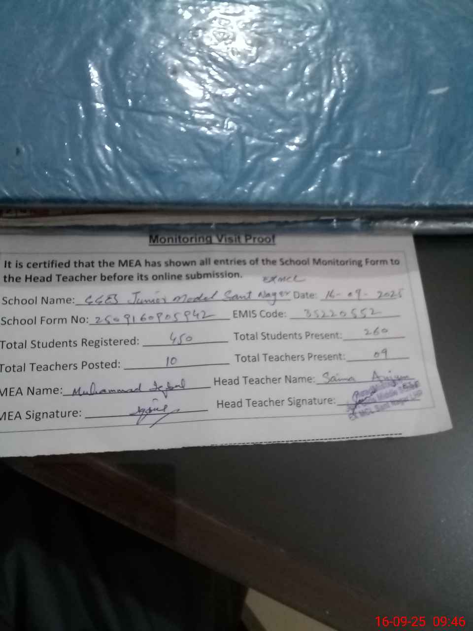 | Certified that this School was Inspected by the Undersigned MEA/DMO Today and the Information Stated Above is as Per Record. | |||||