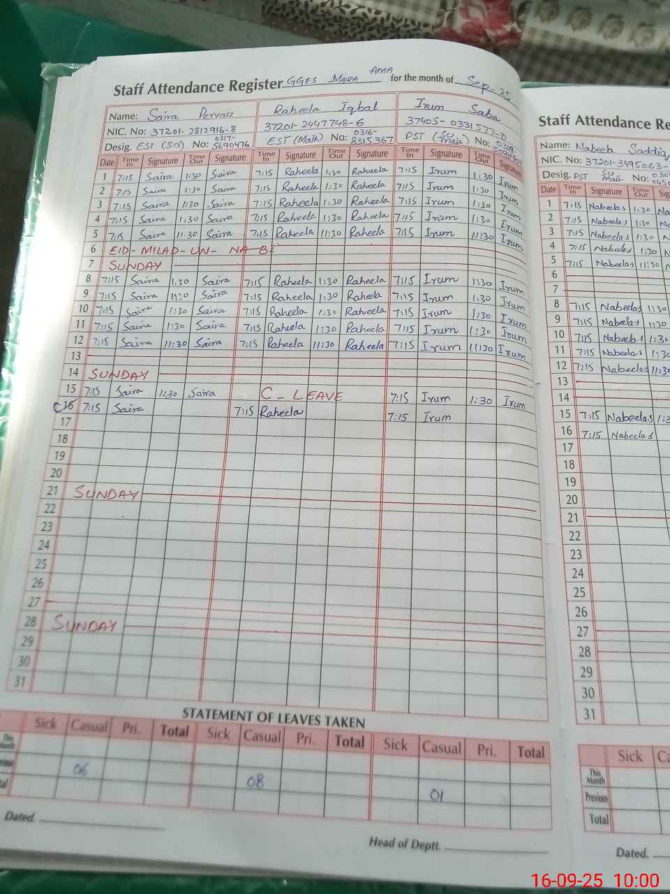 | CNIC | Full Name | Designation | R/C | Absence During Last Calender Month |