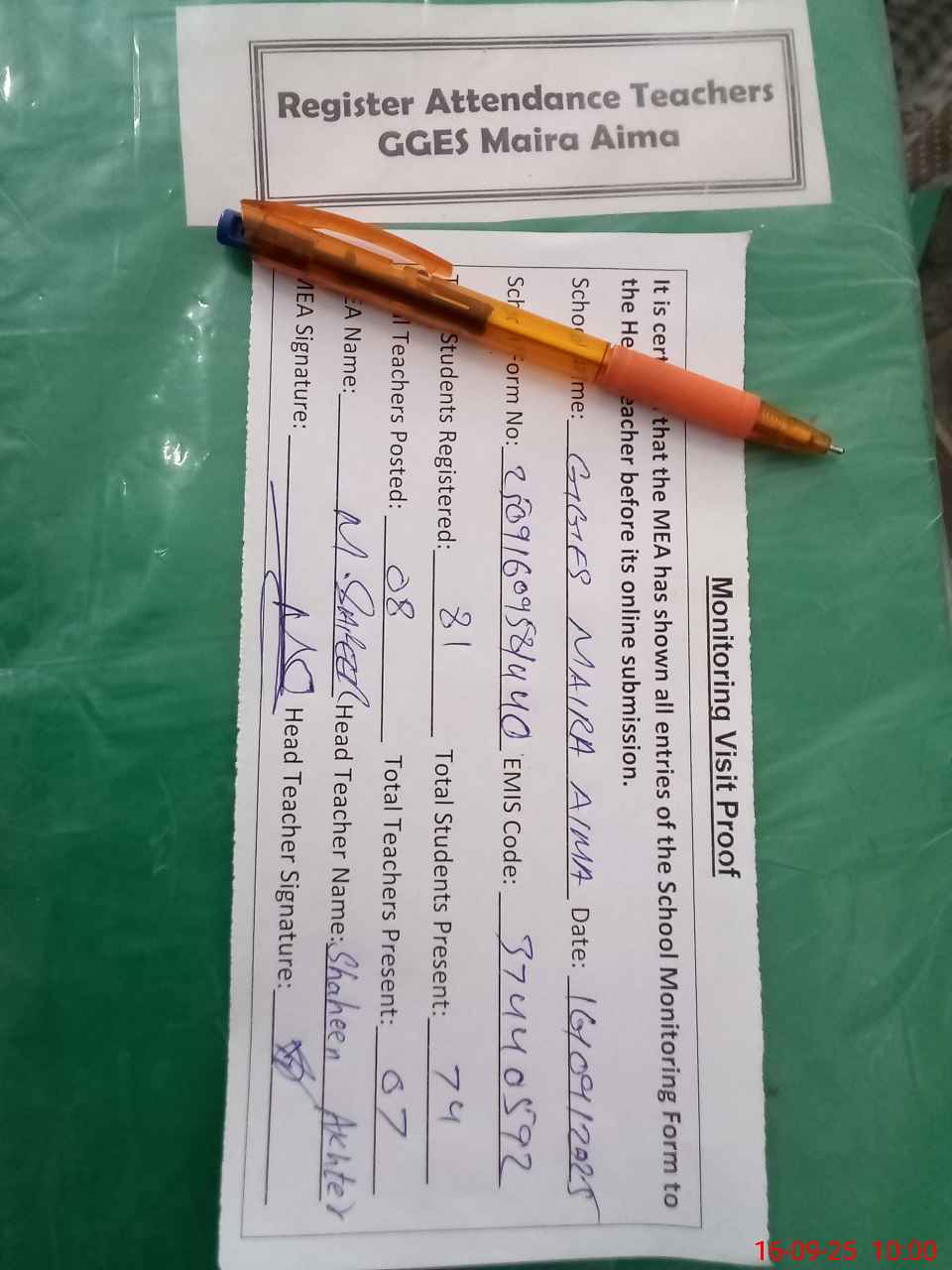 | Attendance Register | Head Teacher | MEA with School | Visit Proof |