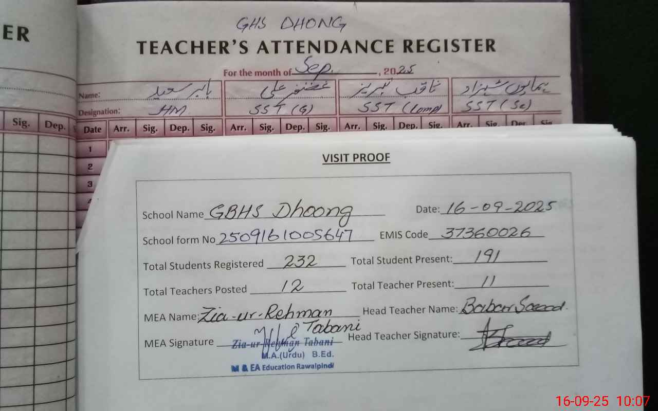 | Attendance Register | Head Teacher | MEA with School | Visit Proof |