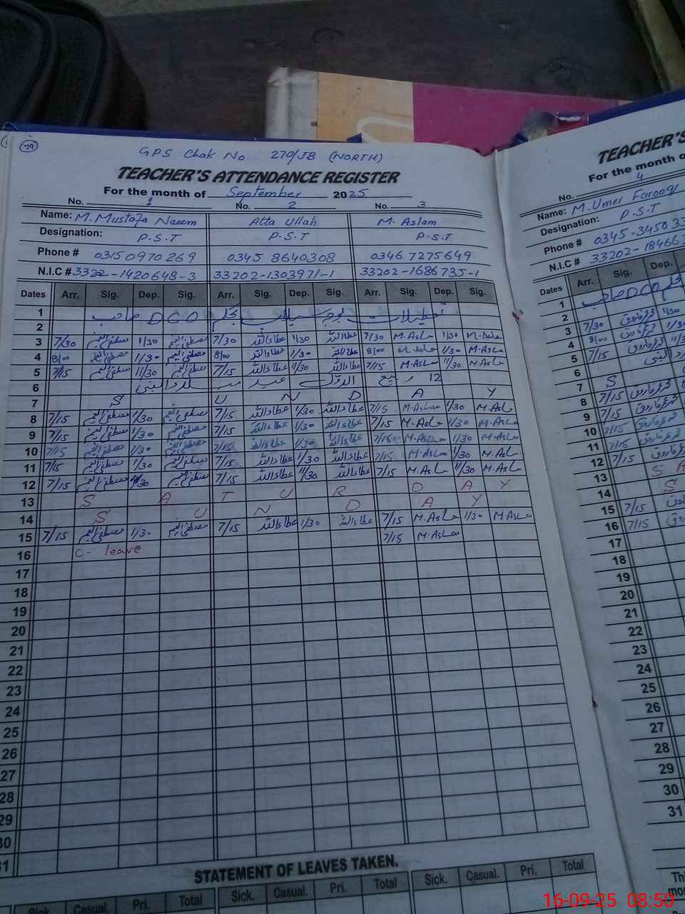 | CNIC | Full Name | Designation | R/C | Absence During Last Calender Month |