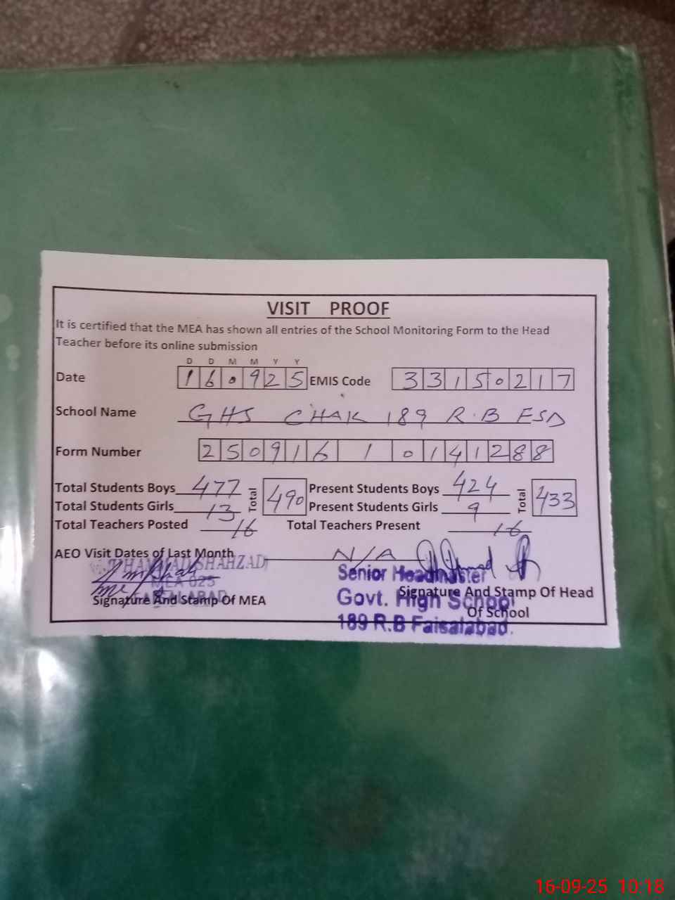 | EMIS Code: 33150217 | Name of School: GHS CHAK 189 RB FSD | |||