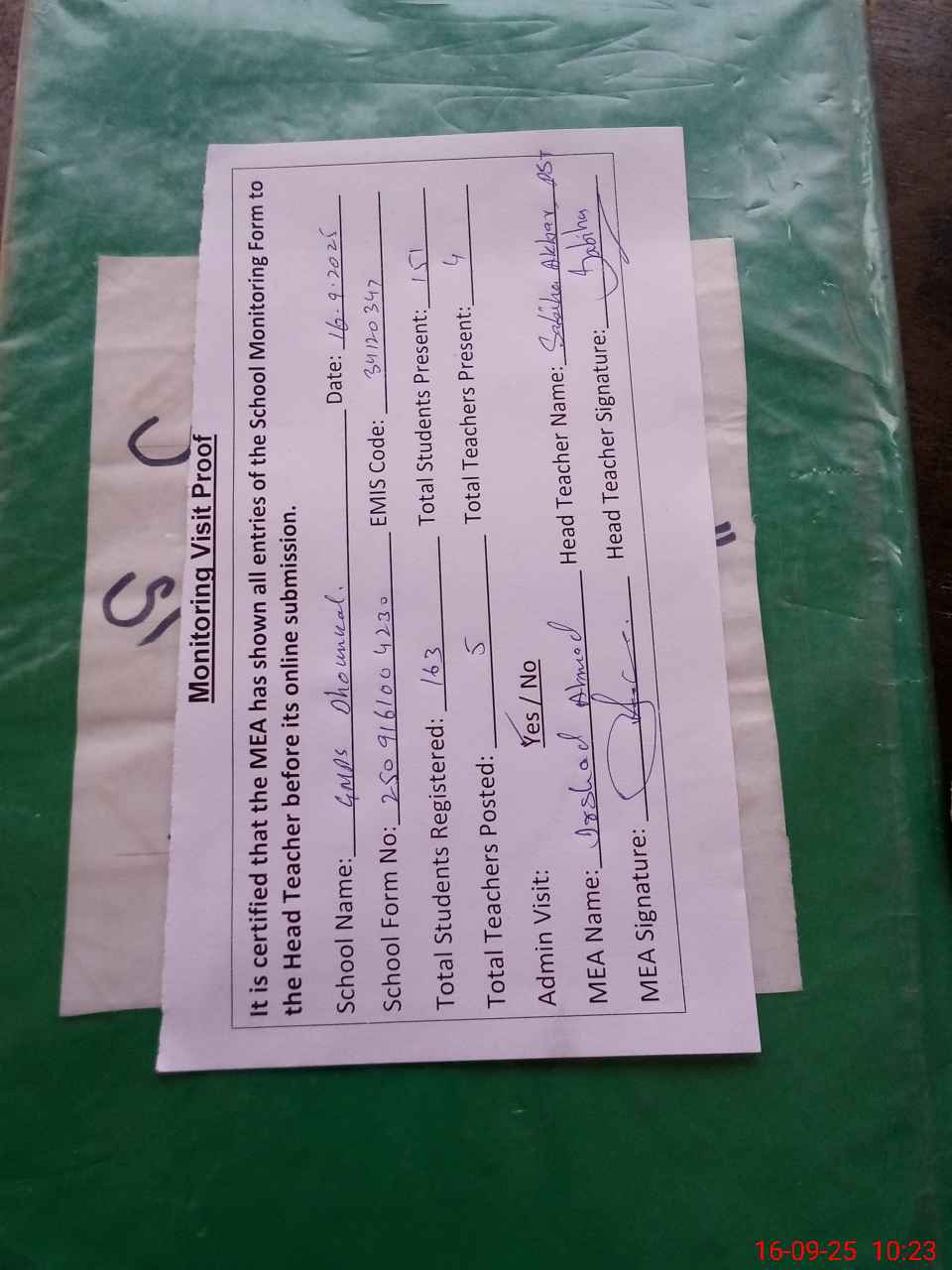 | Attendance Register | Head Teacher | MEA with School | Visit Proof |