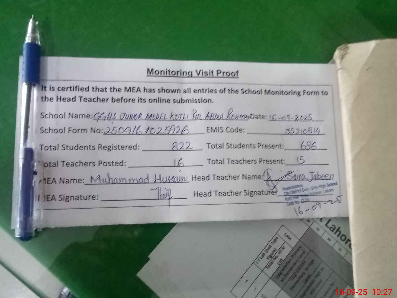 | EMIS Code: 35210814 | Name of School: GGHS JUNIOR MODEL KOTLI PIR ABDUL REHMAN (EX-MCL) | |||