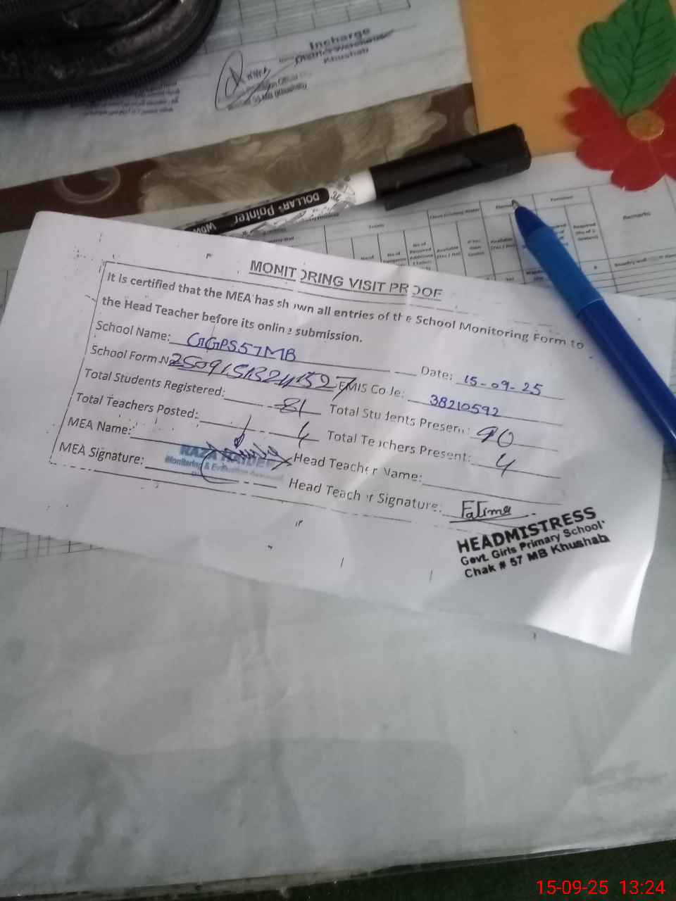 | Attendance Register | Head Teacher | MEA with School | Visit Proof |