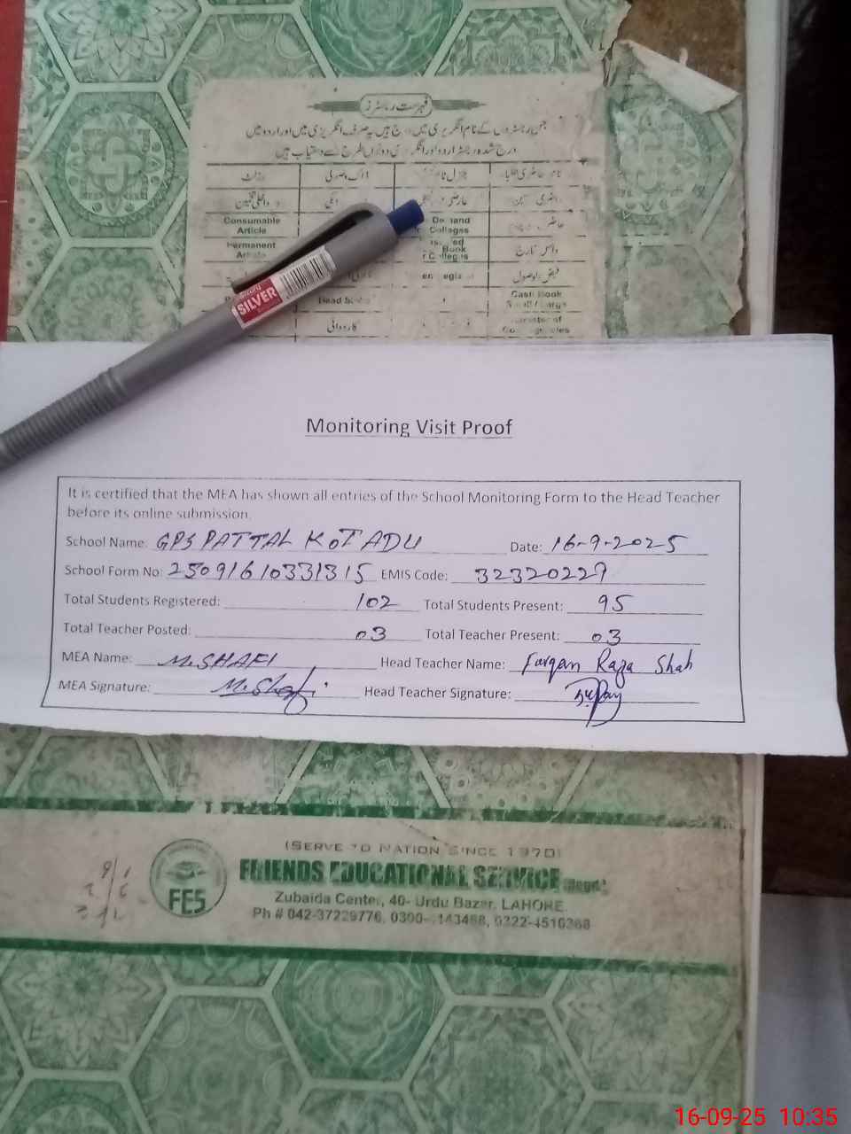 | Attendance Register | Head Teacher | MEA with School | Visit Proof |