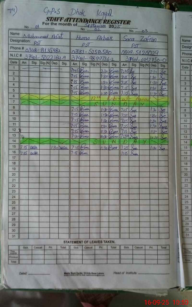 | CNIC | Full Name | Designation | R/C | Absence During Last Calender Month |