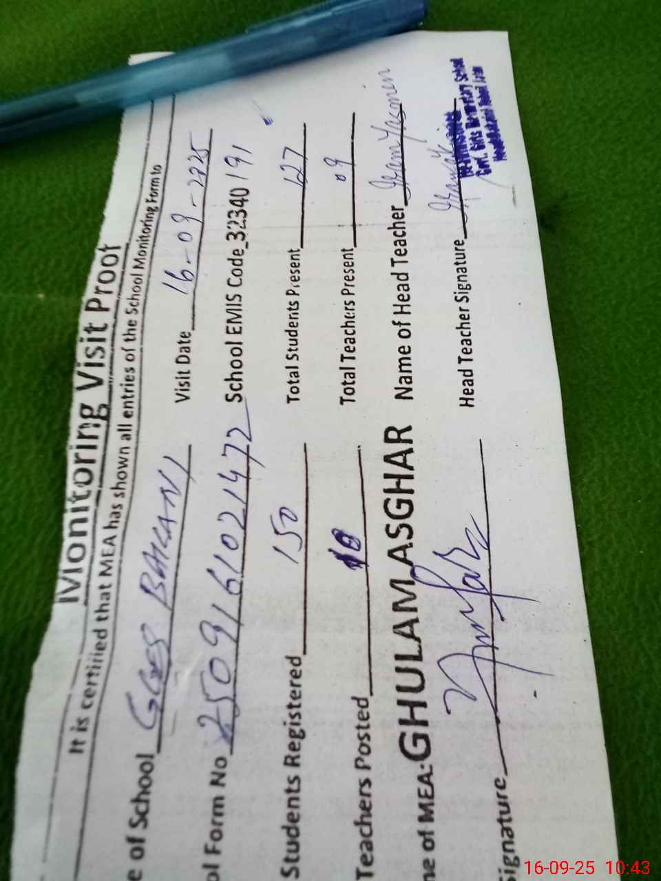 | Attendance Register | Head Teacher | MEA with School | Visit Proof |