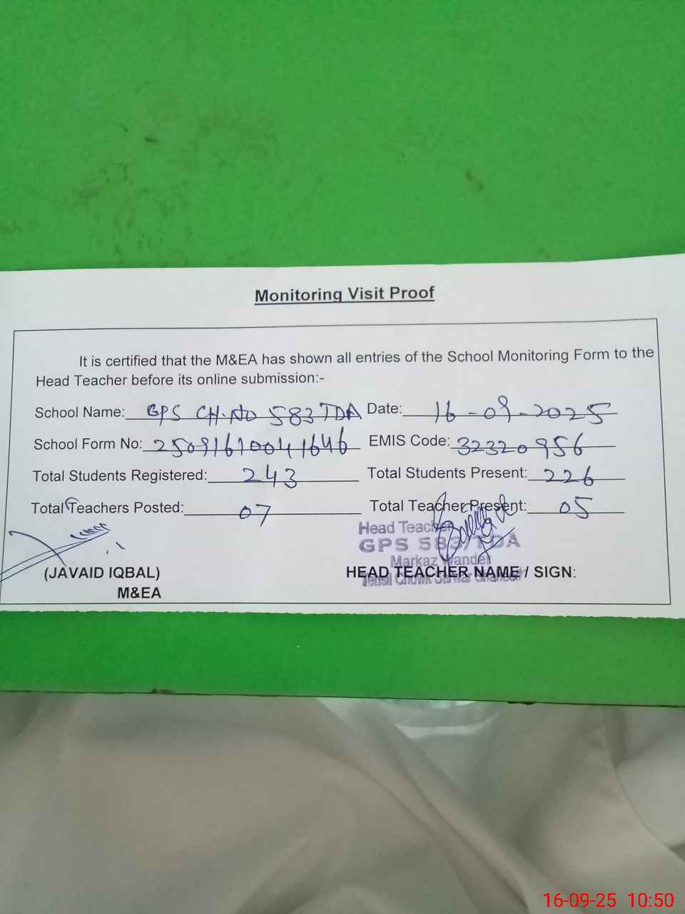 | Attendance Register | Head Teacher | MEA with School | Visit Proof |
