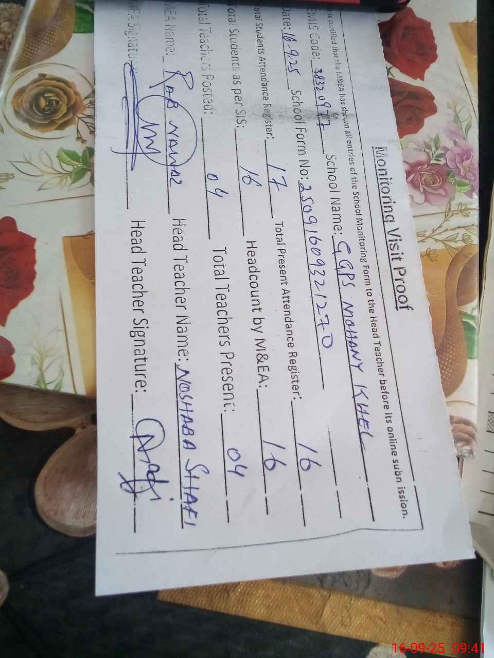 | Attendance Register | Head Teacher | MEA with School | Visit Proof |