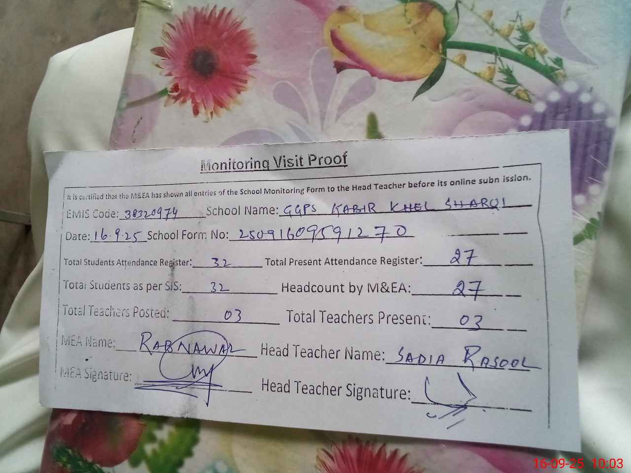 | Attendance Register | Head Teacher | MEA with School | Visit Proof |