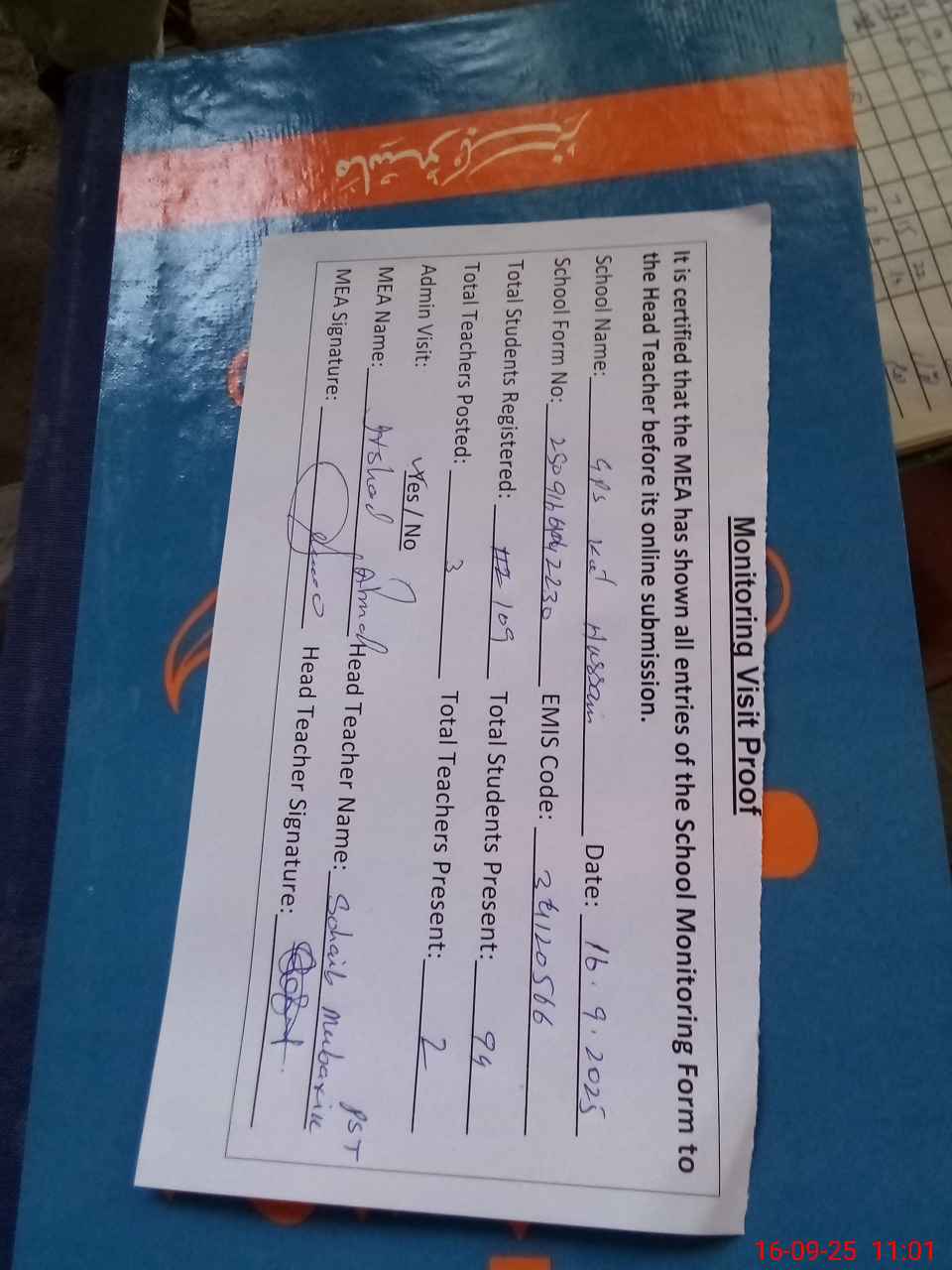| Attendance Register | Head Teacher | MEA with School | Visit Proof |