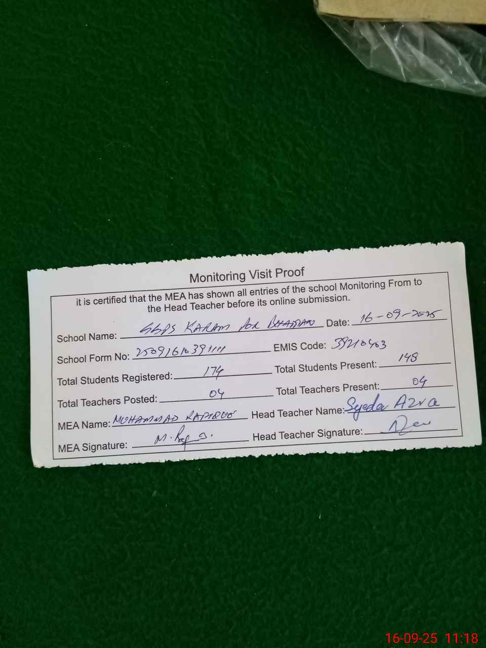 | Attendance Register | Head Teacher | MEA with School | Visit Proof |