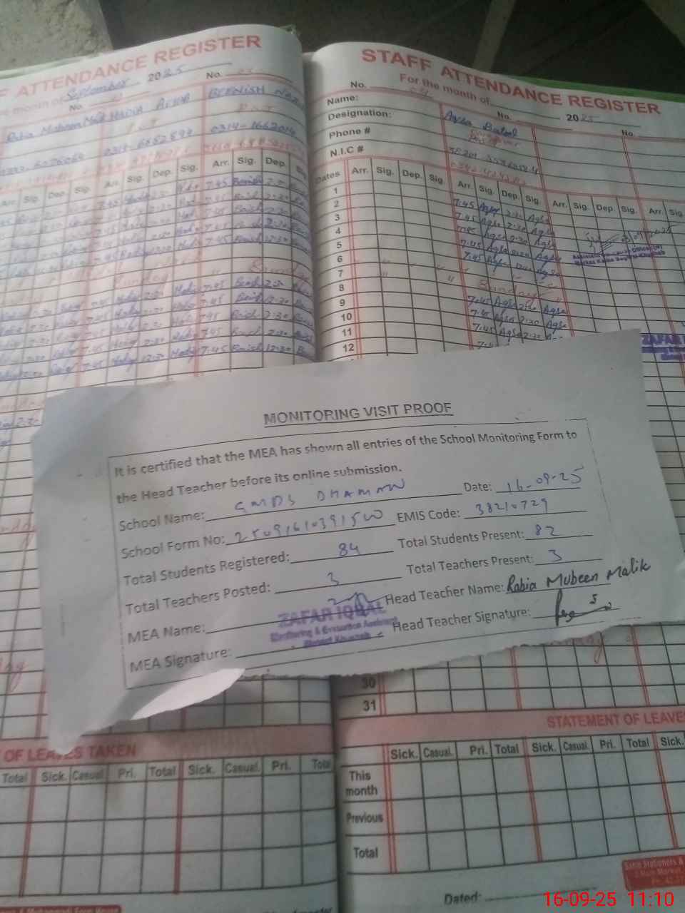 | Attendance Register | Head Teacher | MEA with School | Visit Proof |