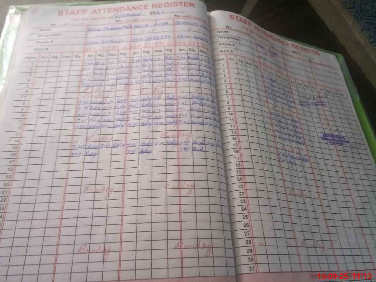 | CNIC | Full Name | Designation | R/C | Absence During Last Calender Month |